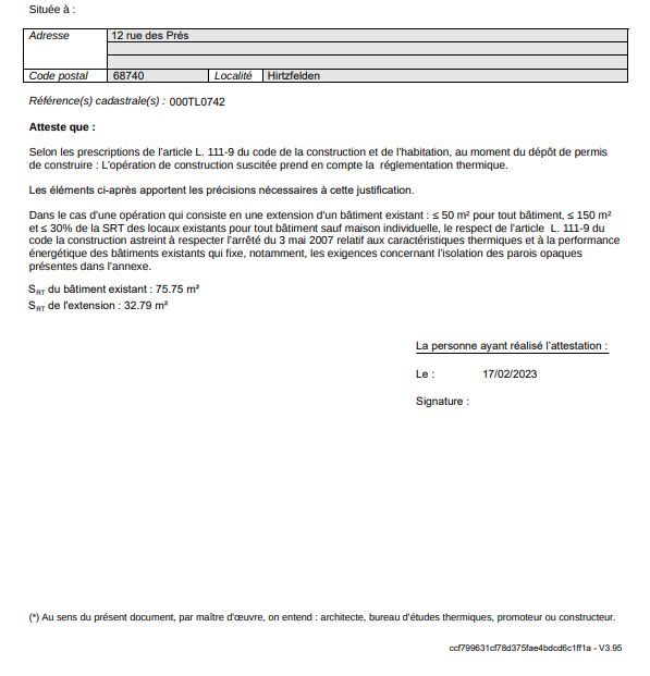 Vient après le second alinéa qui mentionne le lieu de construction ou d’extension et stipule que votre dossier a été pensé selon la réglementation thermique applicable.
